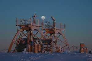 ? E. Aristidi (2006)The instruments used to test the site of Dome C are installed on the ground or on wood platforms at 8 m above the ground-level. The two towers of the Concordia station are in the background.