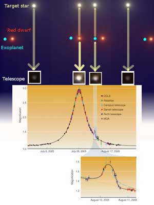 When a red dwarf-like star passes between a bright star located in the galactic bulge and an observer, it acts as a lens by magnifying the light detected by the astronomers. This passage results in a peak of brightness across the time. If a dwarf red is orbited by an exoplanet, its presence results in a weaker brightness magnification than the previous one. This is the case on this curve which shows the presence of a terrestrial type planet, of 5.5 earth masses, located at some 20.000 light-years from our solar system.